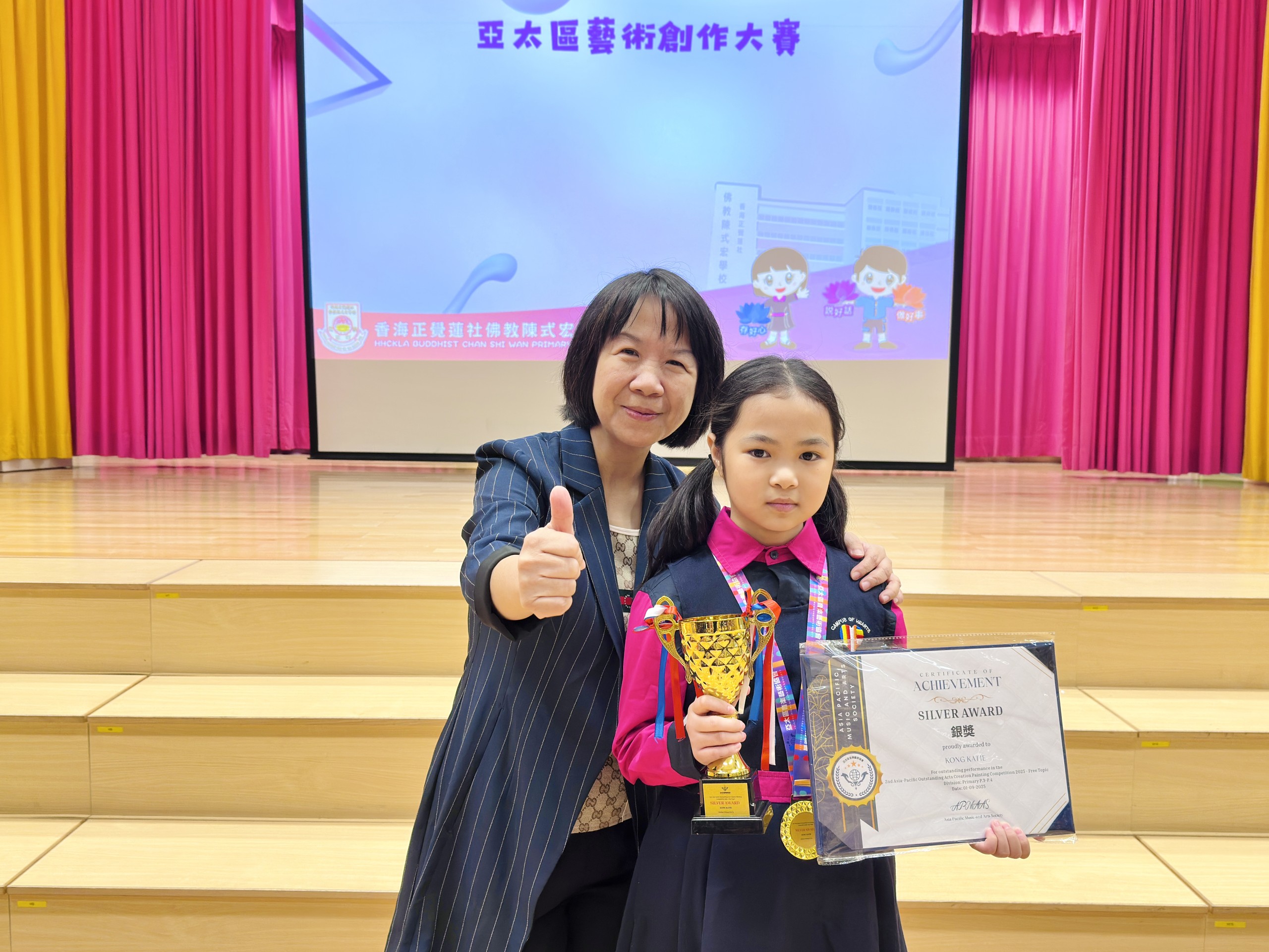 4C班鄺彩婷同學在「亞太區藝術創作大賽」的藝術殿堂中,以一幅意境悠遠的水墨畫作,於競爭激烈的小學P3-P4繪畫組中榮獲銀獎。
