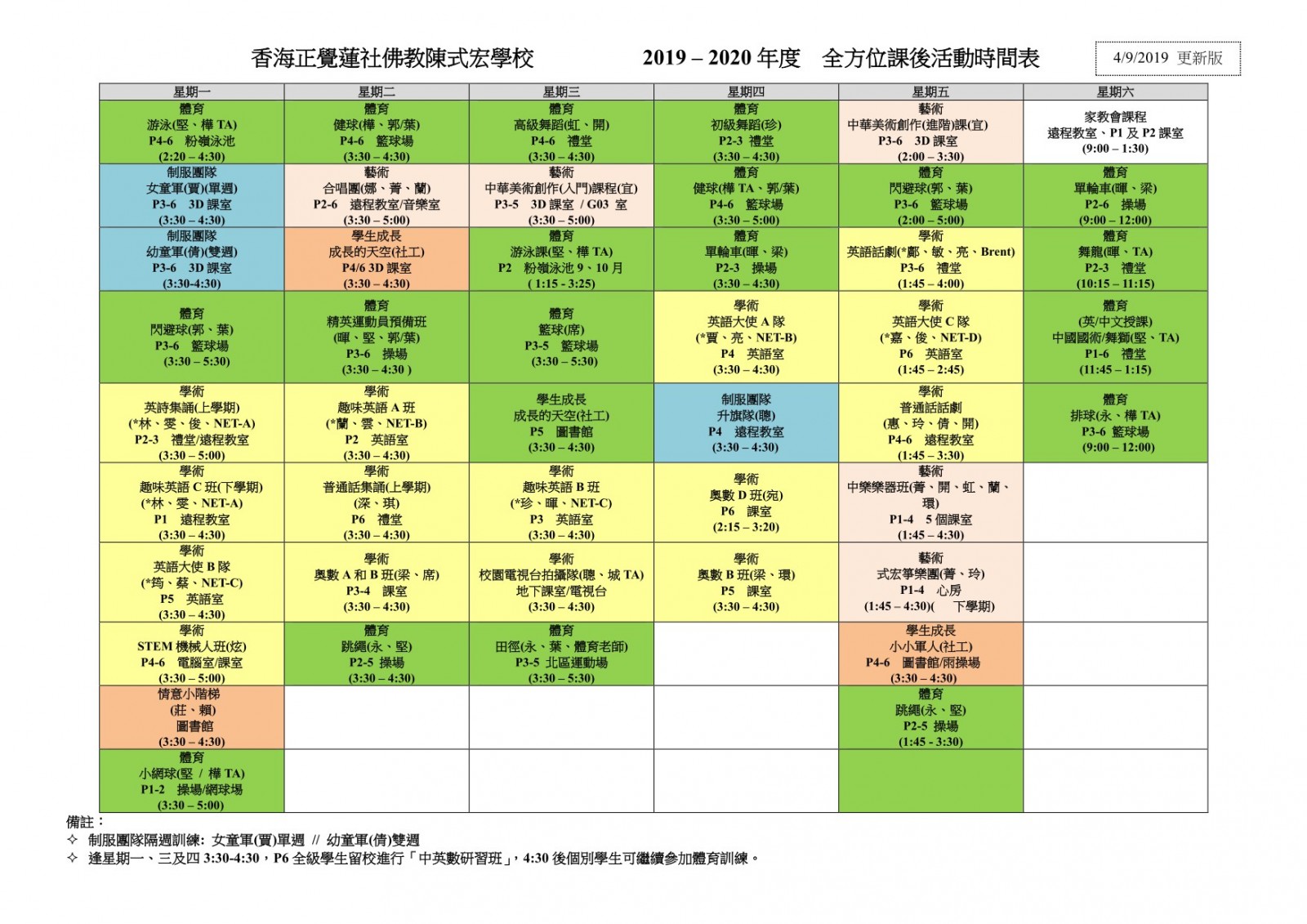 課後訓練時間表