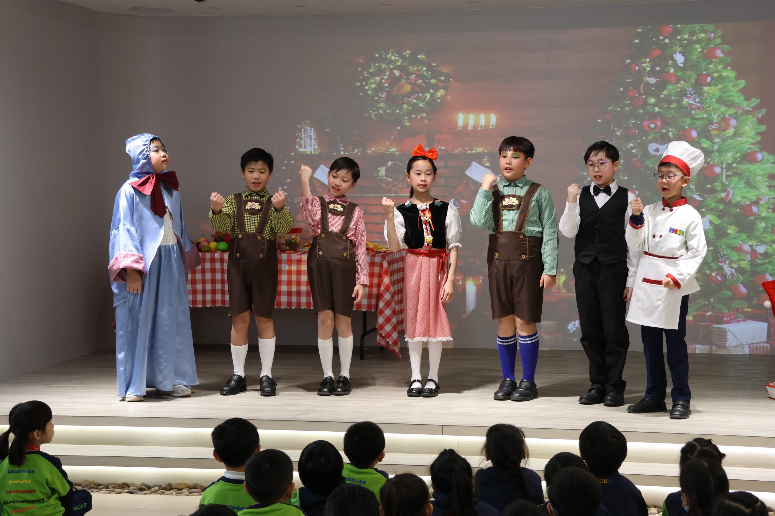 Students of all levels come to the covered playground to enjoy winter-themed fun while using their English skills in various activities. Additionally, they watch a Christmas show about the "Three Acts of Goodness." Through the show, they learn that Christmas means sharing love, not just receiving presents.